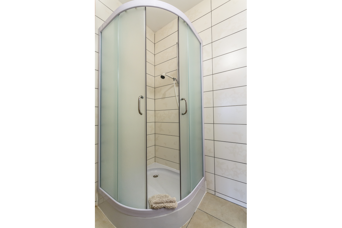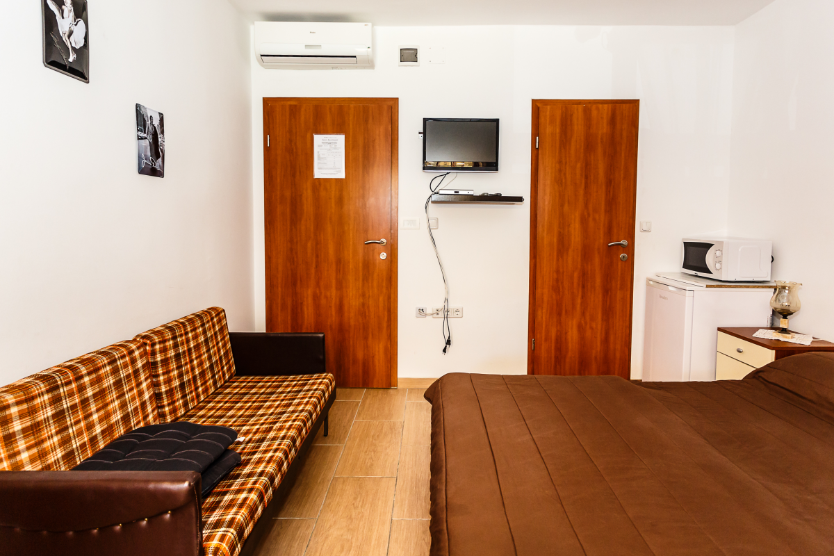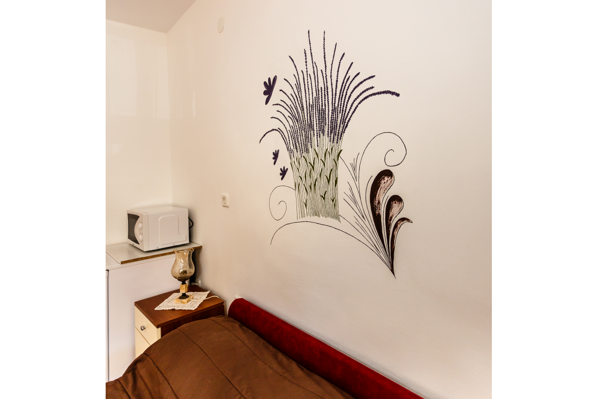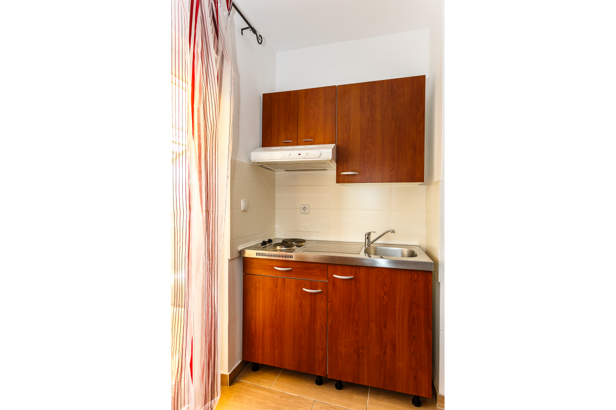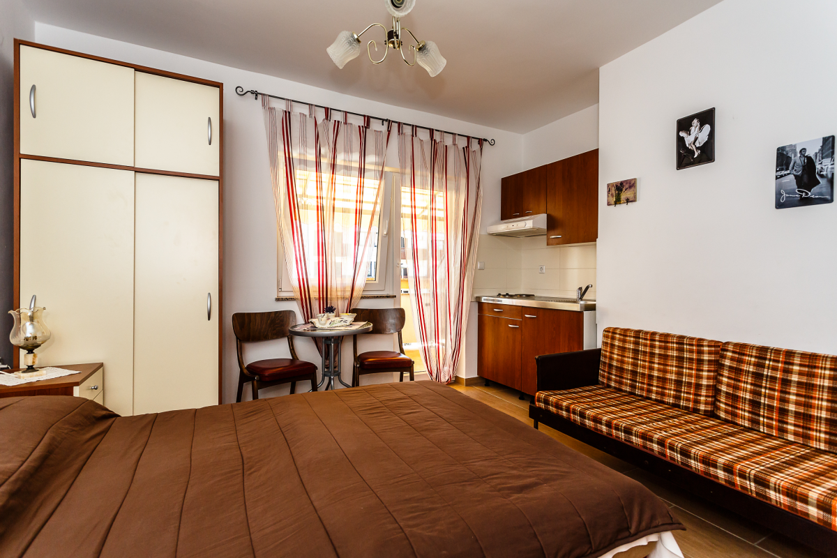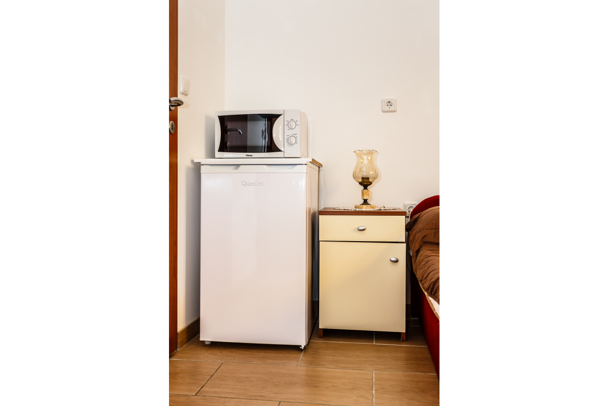 Studio apartment 6 – AS6 can welcome 2 people since it is equipped with one double bed. It has a modest kitchen area with stove, fridge with little freezer, microwave oven, coffee machine, electric kettle and dishes. There is one bathroom with shower and towels are available on request. If you don’t want to miss any of the TV shows while on holiday, there is a satellite TV across from bed and Wi-Fi network covering the entire apartment.